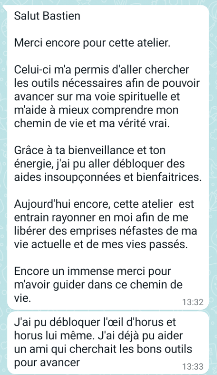Je voulais te dire merci pour ta bienveillance, pour ce que tu nous as fait vivre. Je n’avais jamais vécu ça — retrouver mon moi du Moyen Âge, qui a fusionné avec moi. (…) Un sentiment de sérénité, de partage, de parole libérée, de confiance M. R.